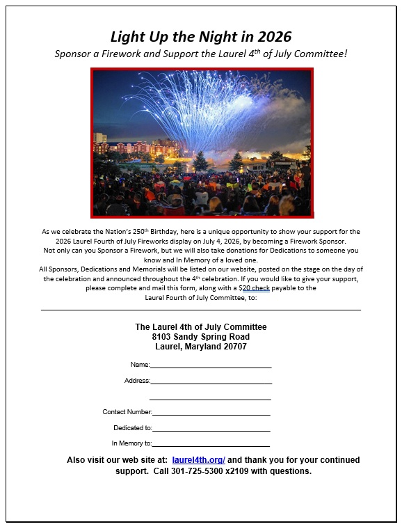The Laurel Fourth of July Committee invites the public to help raise funds for the Laurel Fourth of July Celebration by sponsoring a firework. This is a unique opportunity to show support for the 2026 Laurel Fourth of July Fireworks display. Cost to sponsor or dedicate a firework is $20 and is tax deductible. The flyer with the form is on the Laurel Fourth of July website at www.laurel4th.org or stop in at the Laurel Municipal Center and pick up a form in the front lobby. All proceeds will go to help fund your Independence Day Celebration which will be held on Saturday, July 4, 2026.
